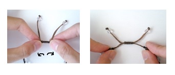 ②腕を通して水晶のビーズをつかみ、反対の手で引っ張ります。