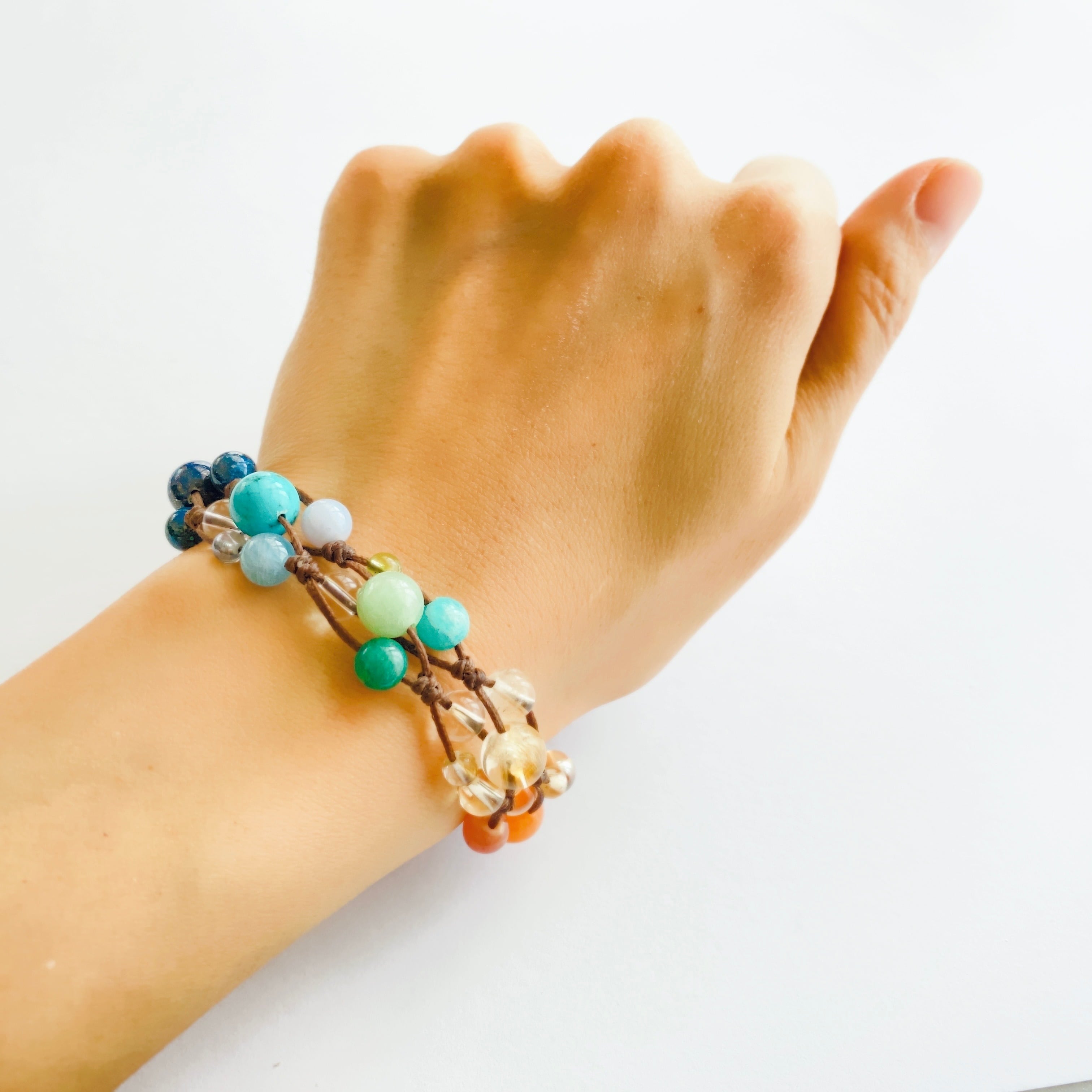 (8mm)ボツワナアゲート、カーネリアン、シトリン、ひすい、ターコイズ、ラピスラズリ、スギライト (6mm)ガーネット、シリシャスシスト、ロードクロサイト、ゴールデンオーラ、シトリン、ロシア産アマゾナイト、モザンビーク産アマゾナイト、アクアマリン、ブルーレースアゲート、クリソコラ、ラピスラズリ、アメジスト、ラベンダーアメジスト (4mm)ガーネット、シトリン、ルチルクォーツ、ペリドット、アクアオーラ、コスモオーラ、アメジスト