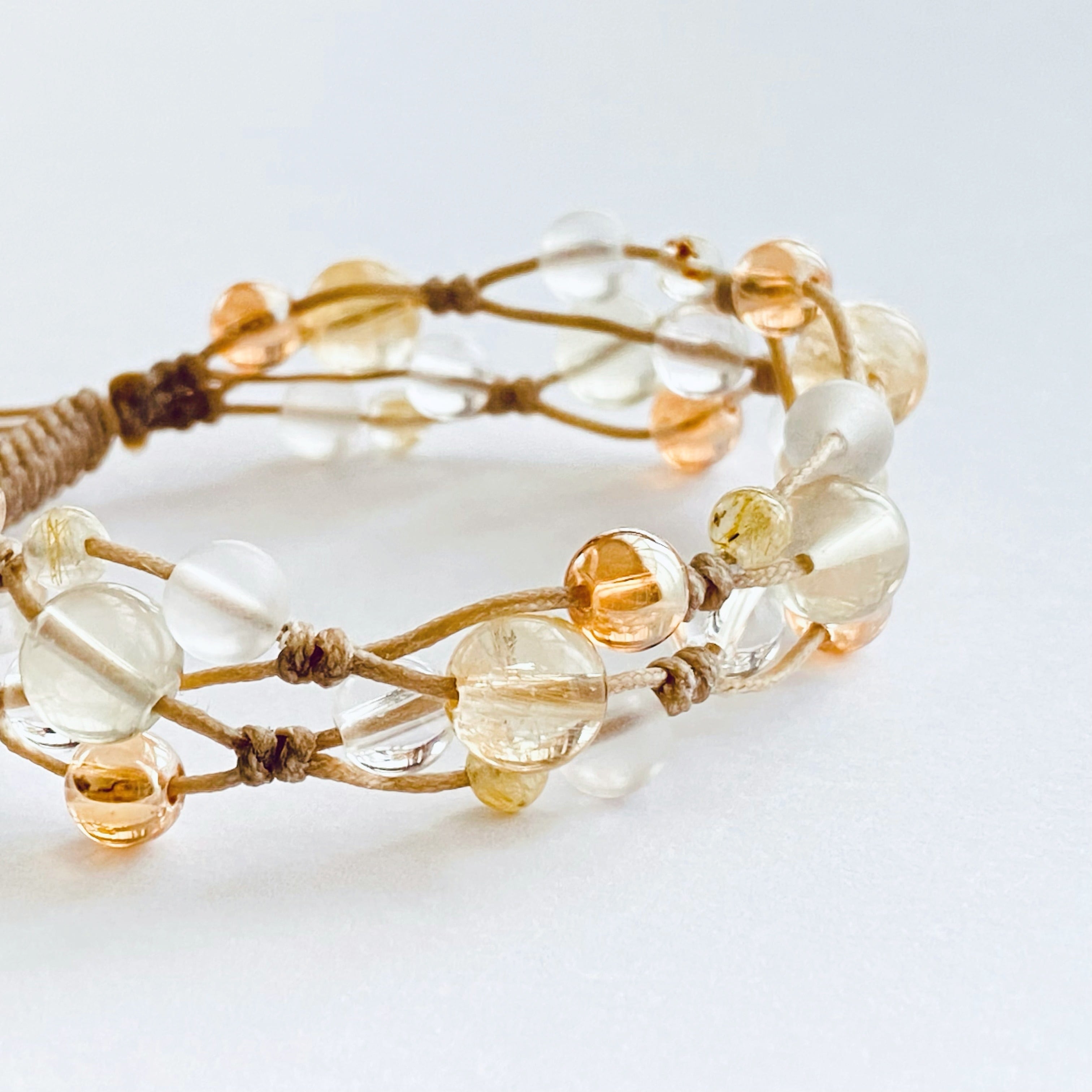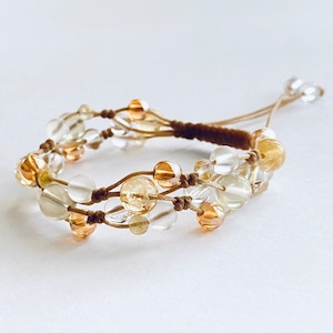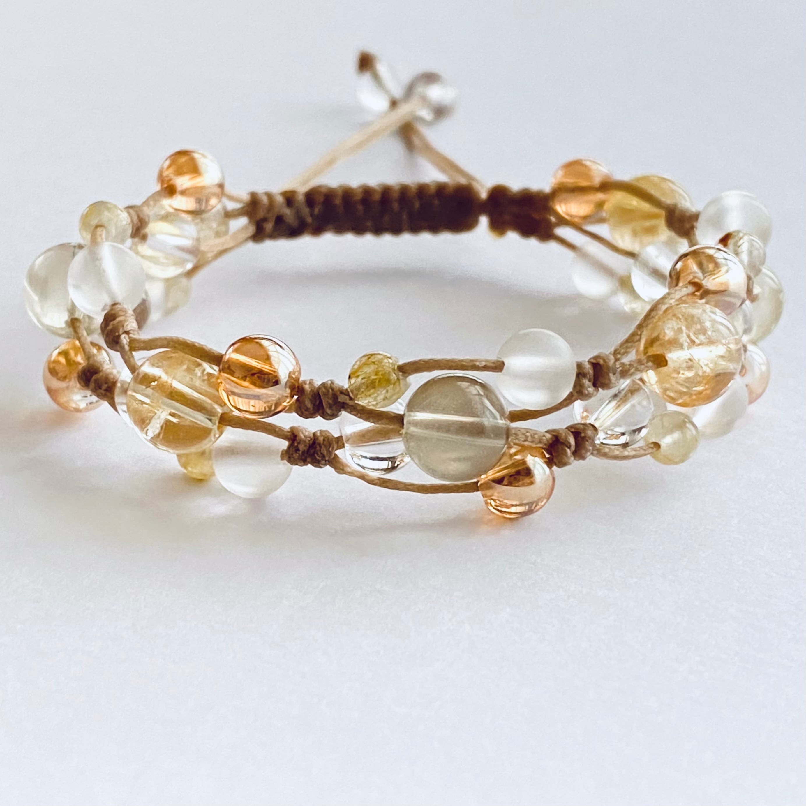 シトリン8mm、レモンクォーツ8mm、ゴールデンオーラ6mm、フロスティクォーツ6mm、水晶6mm、ルチルクォーツ4mm